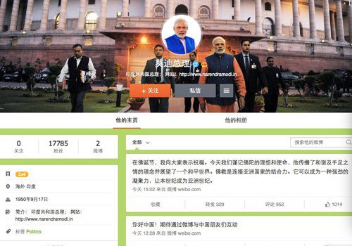 據(jù)媒體報(bào)道,莫迪計(jì)劃于本月訪問(wèn)中國(guó)。他也成為又一位開展“微博外交”的外國(guó)國(guó)家領(lǐng)導(dǎo)人。此前,已經(jīng)有4個(gè)國(guó)家的領(lǐng)導(dǎo)人開通了新浪微博,其中澳大利亞前總理陸克文是第一位,委內(nèi)瑞拉總統(tǒng)尼古拉斯·馬杜羅和英國(guó)首相卡梅倫均在2013年開了微博,以色列前總統(tǒng)西蒙·佩雷斯于2014年開通。