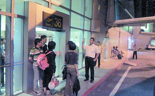 凌晨1點(diǎn)上了一架飛機(jī),3點(diǎn)又被通知下來。深夜,一些乘客干脆站到候機(jī)樓門口等待飛機(jī)到來。