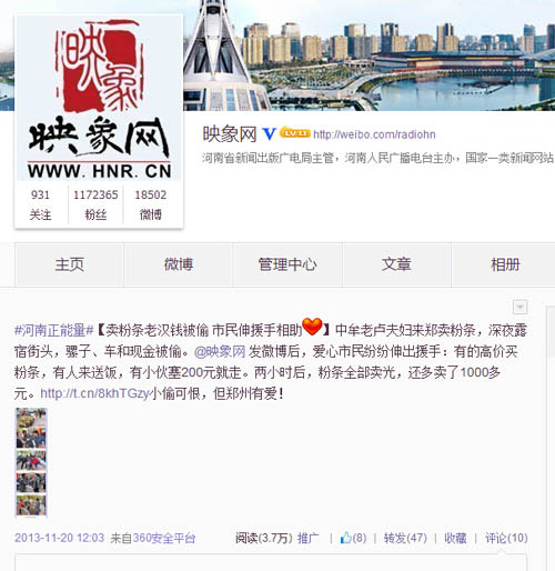 “老漢錢被盜,鄭州市民網友義買粉條”微博發(fā)布于2013年11月19日,當天,映象網記者在街頭采訪,偶遇中牟縣的一位農家老漢與老伴到鄭州賣粉條,不料騾子被偷,錢也被盜。映象網迅速發(fā)布新聞,并連續(xù)發(fā)布多條微博,呼吁市民網友伸出援手幫助兩位老人,迅速引發(fā)關注,短時間內轉發(fā)量超過200次,閱讀量接近20萬次,引發(fā)眾多愛心市民網友前往購買粉條,400多斤粉條在兩個小時內被搶購一空,丟失的騾子也成功找回。