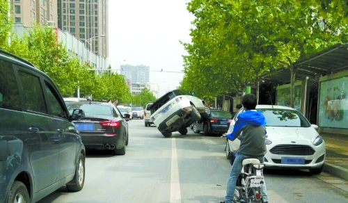 昨日上午10點(diǎn)20分,鄭州興華南街南三環(huán)公交站臺(tái)發(fā)生的一幕引起眾人圍觀:一輛路虎車“騎”在奧迪車上。