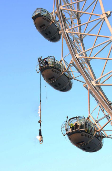 喜愛魔術(shù)的人一定不會對逃生術(shù)感到陌生。然而,在幾十米的高空表演玩命逃生術(shù)的恐怕并不多見。據(jù)英國《每日郵報》3月5日報道,“倫敦眼”摩天輪上5日就上演了一幕玩命逃生術(shù):表演者將自己倒掛在摩天輪上,僅用了幾分鐘就擺脫了燃燒的繩子成功逃生。
