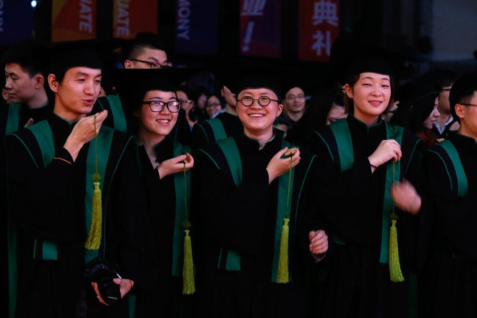 圖為畢業(yè)典禮上分別身著博士服、導(dǎo)師服、碩士服(從左到右)亮相的學(xué)生老師。
