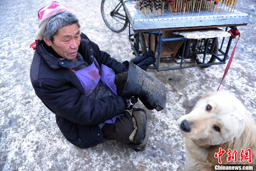 2月6日,在長春市一條繁華的街路上,一只小狗幫助身殘主人拉車賣冰糖葫蘆,成為長春冬日街頭一道感人的風(fēng)景線。據(jù)主人介紹,雖然自己身殘且貧窮,但并不想靠別人救濟度日,因此學(xué)會了制作冰糖葫蘆的手藝,并以此自食其力。而他養(yǎng)的這條小狗“大黃”也是對主人不離不棄,每日都會幫助主人拉車外出謀生。圖為主人在整理捆綁腿的帶子。張瑤 攝