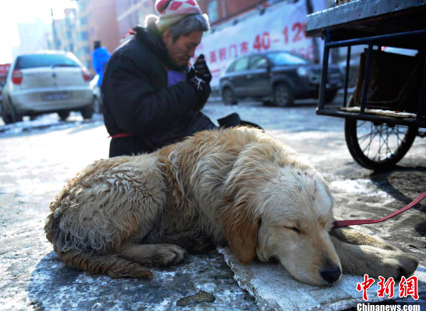 2月6日,在長春市一條繁華的街路上,一只小狗幫助身殘主人拉車賣冰糖葫蘆,成為長春冬日街頭一道感人的風(fēng)景線。據(jù)主人介紹,雖然自己身殘且貧窮,但并不想靠別人救濟度日,因此學(xué)會了制作冰糖葫蘆的手藝,并以此自食其力。而他養(yǎng)的這條小狗“大黃”也是對主人不離不棄,每日都會幫助主人拉車外出謀生。圖為主人走累了抽根煙歇息的時候,小狗也在旁邊小憩一下。張瑤 攝