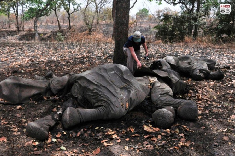 1989年,聯(lián)合國(guó)CITES公約全面禁止象牙貿(mào)易,以遏制非洲大象被大規(guī)模殺戮的趨勢(shì)。但象牙走私、販賣的巨額利潤(rùn)使得偷獵活動(dòng)屢禁不止。有調(diào)查認(rèn)為,中國(guó)是非法象牙貿(mào)易劇增的最重要因素。圖為一名國(guó)際愛護(hù)動(dòng)物基金會(huì)成員在喀麥隆森林公園檢查一頭遭受獵殺的大象。截至2012年1月,當(dāng)?shù)丶s300-400頭大象被獵殺。CFP