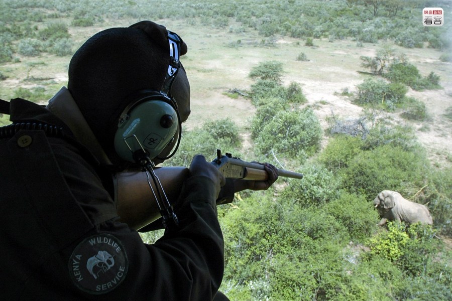 為了打擊武裝盜獵分子,非洲一些國(guó)家組建了特種部隊(duì),以加強(qiáng)國(guó)家公園的護(hù)衛(wèi)工作,但難以阻擋偷獵者的殺戮。圖為2008年3月18日,肯尼亞內(nèi)羅畢,一名肯尼亞野生動(dòng)物保護(hù)局官員向一頭大象發(fā)射鎮(zhèn)靜劑標(biāo),以裝載GPS跟蹤器,監(jiān)管其活動(dòng)范圍和運(yùn)動(dòng)模式,幫助防止偷獵者靠近。REUTERS