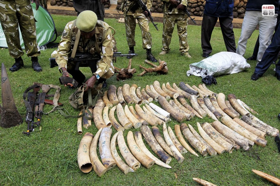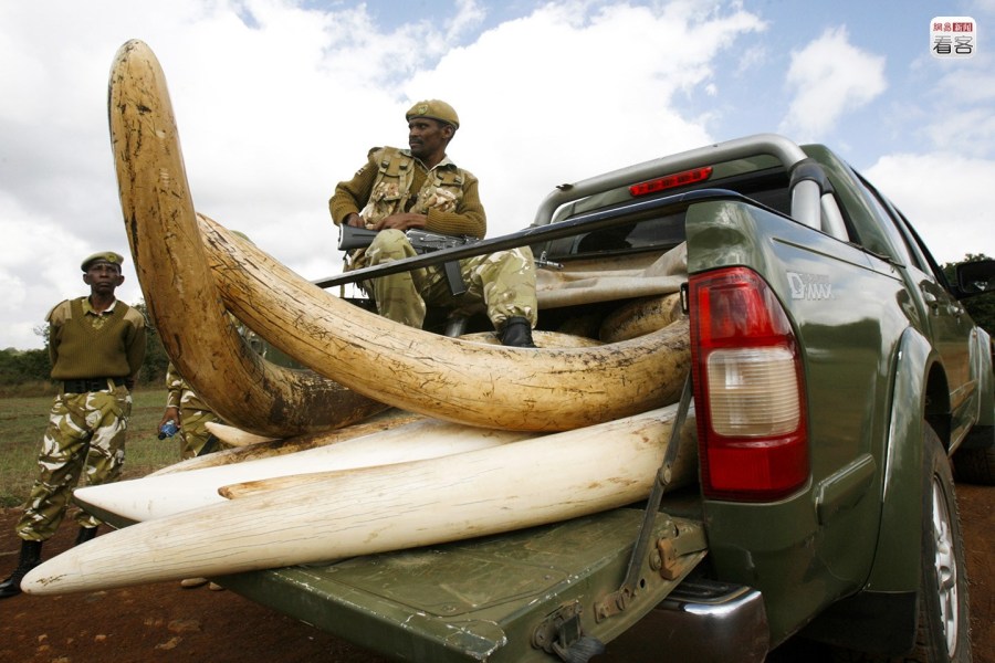 一根血跡未干的非洲象牙,一般由盜獵者通過(guò)南非、津巴布韋等國(guó)的非法象牙集散地,賣給非法象牙經(jīng)銷商。當(dāng)?shù)貢r(shí)間2013年1月6日,肯尼亞內(nèi)羅畢,肯尼亞野生動(dòng)物局官員繳獲一批走私象牙及偷獵者的非法槍支。REUTERS/Noor Khamis
