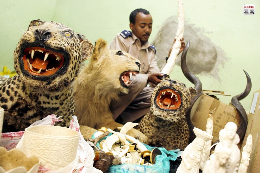 非法象牙經(jīng)銷商將象牙藏在普通集裝箱甚至是行李?yuàn)A層,經(jīng)非洲各國(guó)黑市輾轉(zhuǎn),最終流向亞洲和歐洲。當(dāng)?shù)貢r(shí)間2005年4月14日,埃塞爾比亞亞地斯亞巴貝,埃塞俄比亞警察在警局倉(cāng)庫(kù)檢查一批走私野生動(dòng)物制品,包括約500公斤的非法象牙和動(dòng)物標(biāo)本。AP Photo/Boris Heger