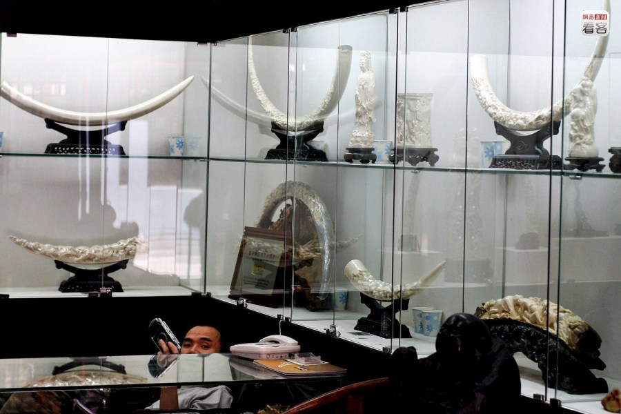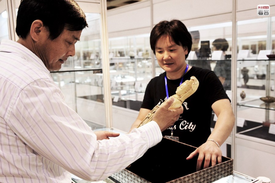 中國(guó)對(duì)象牙市場(chǎng)采用收藏證和特許經(jīng)銷制度,象牙制品一對(duì)一配有國(guó)家林業(yè)局頒發(fā)的收藏證。但中國(guó)一半以上的合法象牙加工銷售企業(yè)牽涉非法貿(mào)易,將走私象牙“洗白”。圖為2010年6月30日,杭州,一名收藏愛好者在西泠春拍預(yù)展上查看一件象牙工藝品。CFP