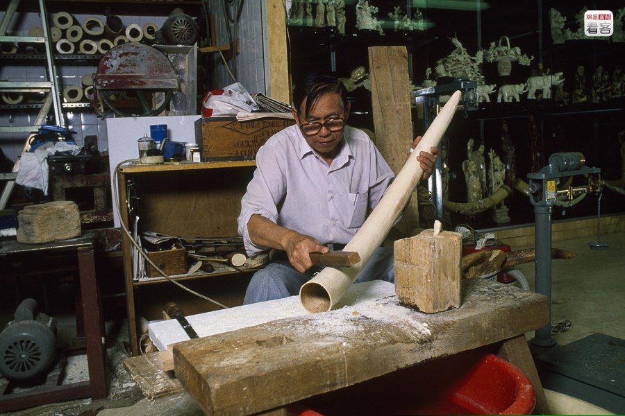 在合法原料中摻入非法原料,走私象牙就被“洗白”,這成為行業(yè)內(nèi)一個(gè)公開的秘密。一個(gè)合法收藏證,可以成為眾多非法象牙制品的“護(hù)身符”。圖為1989年7月,香港,一名象牙雕刻師在工廠工作。Photo by Tom Stoddart/Getty Images