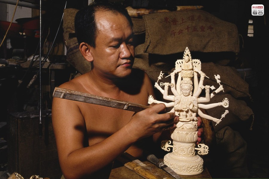 與國(guó)際呼聲背道而馳的是中國(guó)收藏家對(duì)象牙雕刻作品的狂熱。象牙作為一種雕刻的原料,再加上精細(xì)的雕工,所制成的工藝品往往成為收藏家們爭(zhēng)相收藏的對(duì)象。圖為當(dāng)?shù)貢r(shí)間2010年7月14日,香港,一名象牙雕刻師展示他的猛犸象牙雕刻作品。AFP PHOTO/MIKE CLARKE