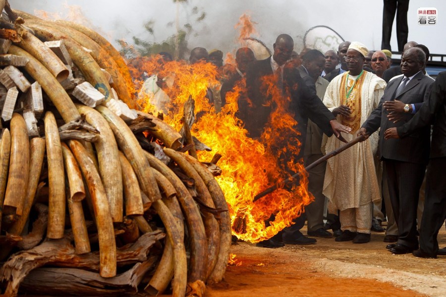 2013年11月,非洲野生動(dòng)物基金會(huì)發(fā)布一項(xiàng)聲明,號(hào)召各國(guó)銷毀庫(kù)存象牙并禁止一切國(guó)內(nèi)象牙貿(mào)易,稱打擊非法象牙唯一有效的方法是消除市場(chǎng)需求。圖為2011年7月20日,肯尼亞,在察沃國(guó)家公園,肯尼亞總統(tǒng)吉巴和隨行人員一起將一堆非法獵取的象牙點(diǎn)燃,以示對(duì)違法狩獵和非法象牙貿(mào)易的打擊決心。CFP