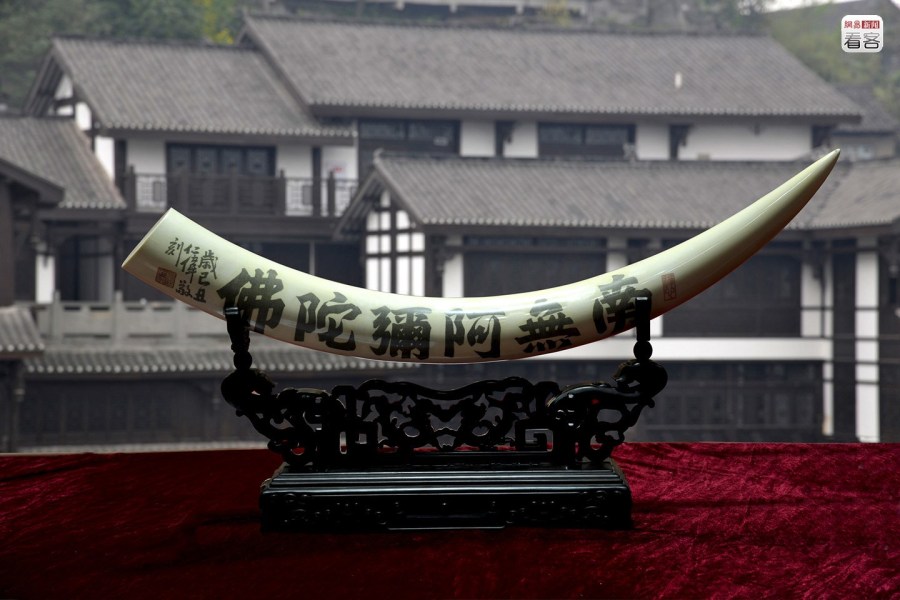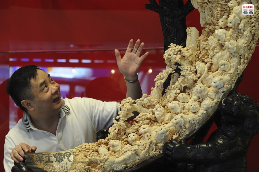 不斷上升的需求驅(qū)動(dòng)象牙價(jià)格的上漲,反過(guò)來(lái)增加了象牙作為資產(chǎn)以保值收藏的吸引力,使象牙的灰色市場(chǎng)不斷運(yùn)轉(zhuǎn)。圖為2012年4月6日,重慶,第五屆中國(guó)工藝品、禮品及家居飾品博覽會(huì)上,一件長(zhǎng)1.1米刻有《金剛經(jīng)》等80部經(jīng)文的象牙微雕作品被估價(jià)千萬(wàn)元以上。CFP