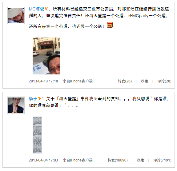 近幾日,三亞“海天盛筵”涉黃,淫亂派對的新聞可謂瘋傳網(wǎng)絡(luò)。早前有媒體報道,三亞市委宣傳部曾于4月4日向媒體發(fā)布新聞通稿,稱已經(jīng)對網(wǎng)上有關(guān)“海天盛筵聚眾淫亂”傳聞?wù)归_調(diào)查,對此事非常重視。三亞警方今日已正式通知“海天盛筵”主辦方三亞鴻洲國際游艇會、“MC白色派對”主辦方MC俱樂部等相關(guān)單位負(fù)責(zé)人于4月8日面談,配合調(diào)查工作。今天,“海天盛筵”主辦方之一,候鳥俱樂部負(fù)責(zé)人陳駿發(fā)微博稱,自己已經(jīng)將所有材料遞交三亞市公安局,將對那些還在繼續(xù)傳播詆毀造謠的人,堅決追究法律責(zé)任。希望可以還海天盛筵一個公道。