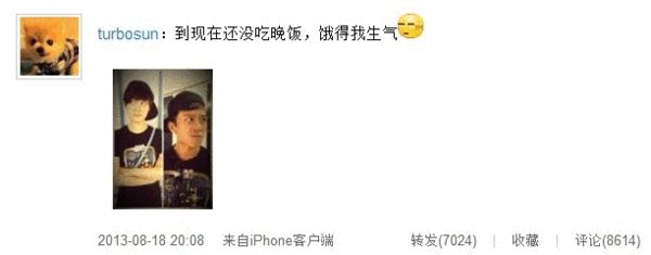 8月18日20點(diǎn)08分,孫儷通過微博曬和鄧超同傳情侶裝的照片,并稱:“到現(xiàn)在還沒吃晚飯,餓得我生氣!”照片中,兩人身穿黑色T恤情侶裝,很默契的把鴨舌帽的帽檐戴在后面,夫妻二人都歪眼斜視,橫眉冷對(duì),看上去似有仇一樣。