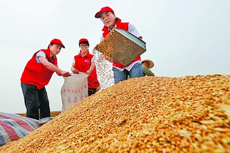 6月7日,在安陽縣倫掌鎮(zhèn)孫家崗村,青年志愿者正在幫助困難戶收麥子。畢興世 李鵬飛 攝