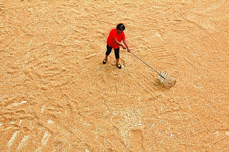 6月9日,內(nèi)黃縣城關(guān)鎮(zhèn)農(nóng)民在晾曬小麥。眼下,該縣83萬多畝小麥喜獲豐收。劉肖坤 攝