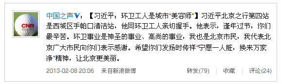 他表示,逢年過節(jié),你們最辛苦。環(huán)衛(wèi)事業(yè)是神圣事業(yè)、高尚事業(yè),我也是北京市民,我代表北京廣大市民向你們表示感謝。希望你們發(fā)揚(yáng)時(shí)傳祥“寧愿一人臟,換來萬家凈”精神,讓北京更美麗。