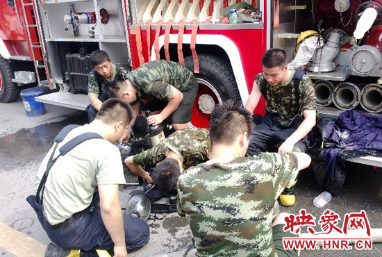 由于天氣炎熱,加上接近火災(zāi)現(xiàn)場、救援時間長,多名消防戰(zhàn)士虛脫暈倒,現(xiàn)場注射和飲用生理鹽水,附近商戶也為消防戰(zhàn)士送來飲用水。