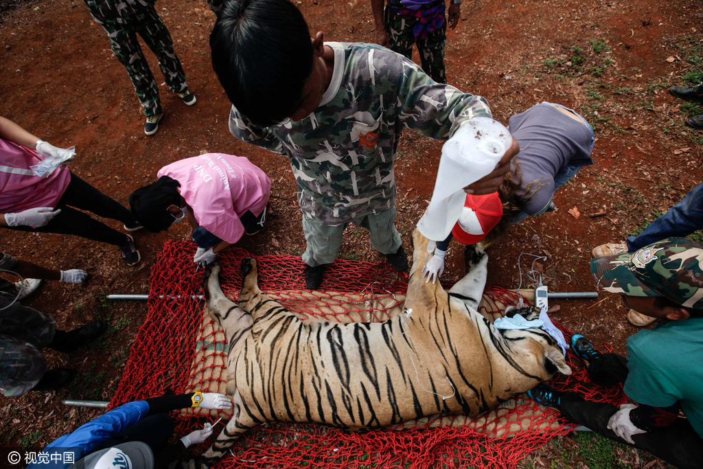 30日,泰國警方和野生動物保護部門的官員在這所佛寺里展開行動,將所有存活的老虎轉(zhuǎn)移至別處安置。湯姆·泰勒來自野生動物之友基金會,他在現(xiàn)場親眼目睹了老虎幼崽尸體被發(fā)現(xiàn)的一幕。據(jù)泰勒稱,冷凍庫里還有其他動物的尸體,而執(zhí)法人員在佛寺里一共找到了137只活老虎,其中40只已被沒收。