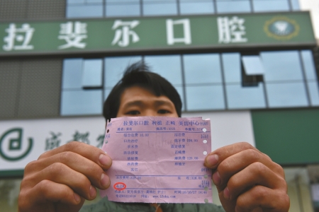26歲的小姜在成都工作,住在姐姐家。一顆緊靠盡頭牙的左下牙把小姜折磨了近一年,平日他只是弄點(diǎn)含片“對(duì)付對(duì)付”。10月27日,小姜終于決定“來個(gè)徹底根治”。當(dāng)天下午1點(diǎn)過,他問姐姐要了300塊錢后,來到位于高新區(qū)府城大道的拉斐爾口腔醫(yī)院。