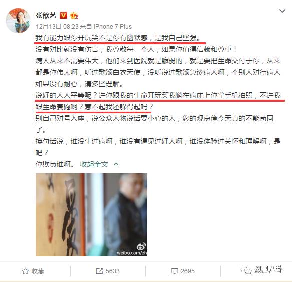 張歆藝不堪被網(wǎng)友吐槽,發(fā)了第二條微博稱“自己沒有針對所有醫(yī)生,只是針對個別沒醫(yī)德的醫(yī)生”,“自己生病躺在床上還被醫(yī)生偷拍”,表明態(tài)度稱“公眾人物也有吐槽的資格,這鍋她不背”