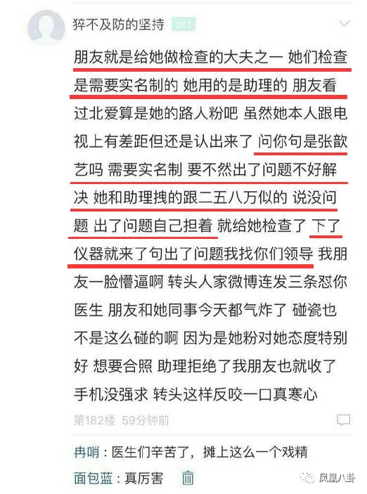 不少網(wǎng)友也補充說明了當(dāng)時的情況,力證醫(yī)生當(dāng)時給張歆藝做了全套檢查,張歆藝在結(jié)束檢查后還威脅醫(yī)生“出了問題找你們領(lǐng)導(dǎo)”。