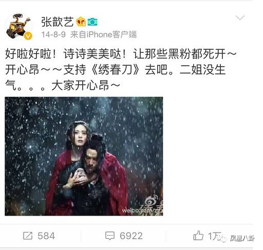 2014年,張歆藝發(fā)一條微博夸贊電影《繡春刀》的導(dǎo)演和男演員。