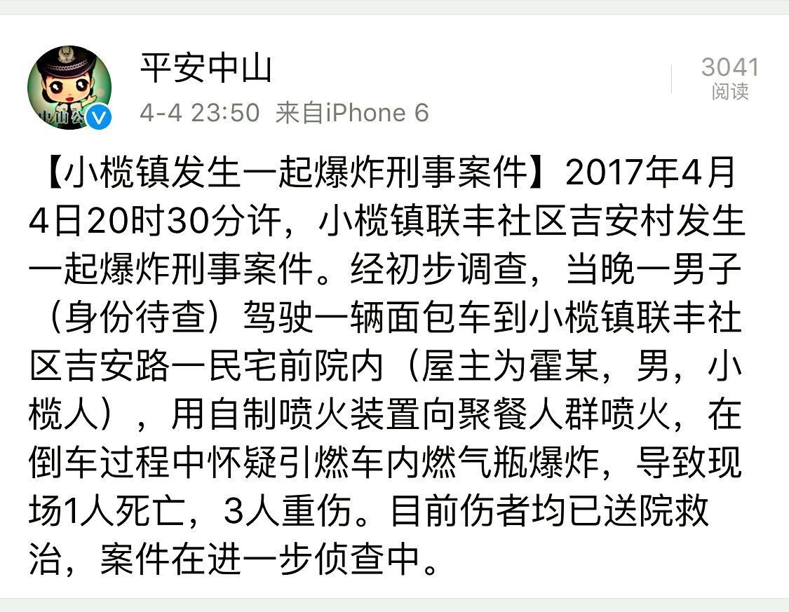 2017年4月4日20時(shí)30分許,小欖鎮(zhèn)聯(lián)豐社區(qū)吉安村發(fā)生一起爆炸刑事案件。經(jīng)初步調(diào)查,當(dāng)晚一男子(身份待查)駕駛一輛面包車到小欖鎮(zhèn)聯(lián)豐社區(qū)吉安路一民宅前院內(nèi)(屋主為霍某,男,小欖人),用自制噴火裝置向聚餐人群噴火,在倒車過(guò)程中懷疑引燃車內(nèi)燃?xì)馄勘?,?dǎo)致現(xiàn)場(chǎng)1人死亡,3人重傷。