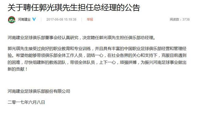 6月8日,中超河南建業(yè)官方宣布,郭光琪將出任俱樂部總部經理一職。俱樂部希望在郭光琪的帶領下,球隊上下一心,為振興河南足球做出新貢獻。河南建業(yè)足球俱樂部董事會經認真研究,決定聘任郭光琪先生擔任俱樂部總經理。