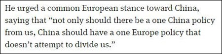 他說:“不能只是要求我們堅持一個中國原則;中國也應(yīng)當(dāng)堅持一個歐洲的立場,不能試圖分裂我們。”