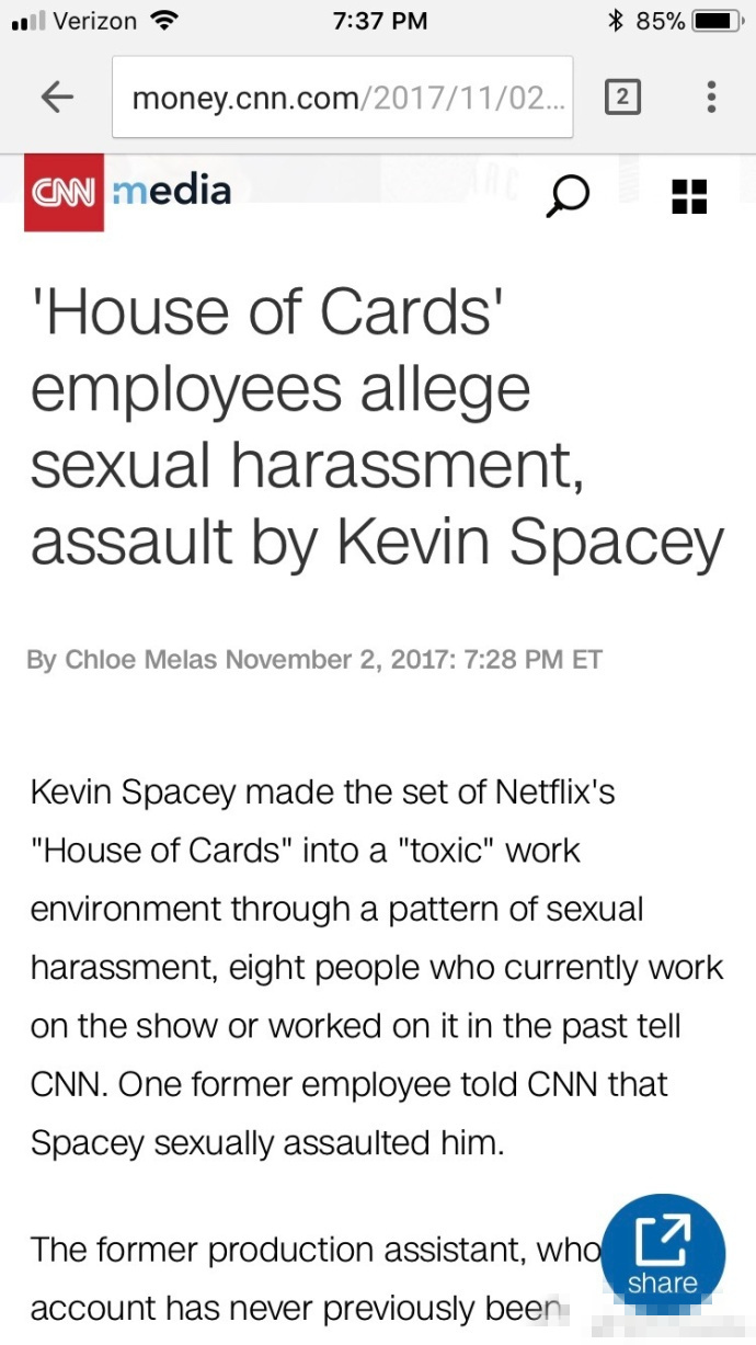 從砍劇到第六季停拍,凱文·史派西性騷擾事件給美劇《紙牌屋》帶來(lái)了不小的風(fēng)波。而據(jù)CNN今日?qǐng)?bào)道稱,目前有8名《紙牌屋》現(xiàn)員工及前員工向他們控訴凱文·史派西曾對(duì)自己實(shí)施性騷擾,其中一名甚至聲稱史派西性侵了他。這8名員工由于害怕講出這件事會(huì)對(duì)自己的事業(yè)產(chǎn)生影響,采用了匿名的方式向CNN揭發(fā)這件事情,他們稱史派西已經(jīng)是個(gè)慣犯,經(jīng)常對(duì)年輕男性有性騷擾行為,包括在對(duì)方不情愿的情況下觸摸、說(shuō)一些粗魯?shù)难哉Z(yǔ)等。