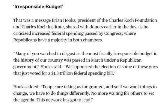 該政策被美國(guó)媒體普遍認(rèn)為是令美國(guó)第二季度GDP沖到4%的重要因素之一,而4%的二季度GDP也是特朗普炫耀自己的一個(gè)重要政績(jī)。可科赫兄弟認(rèn)為這項(xiàng)財(cái)政開(kāi)支政策是極度不負(fù)責(zé)的。