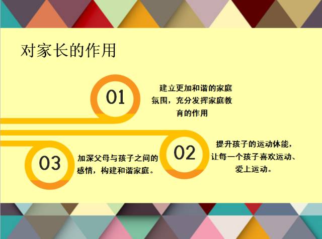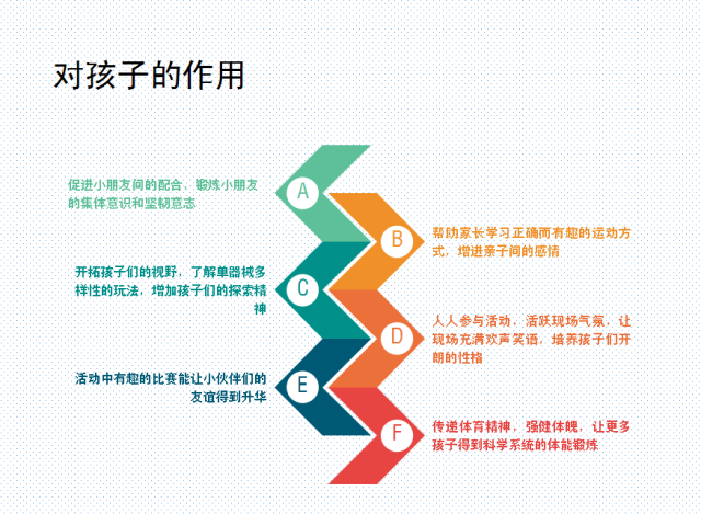 “趣味親子運動趴”根據孩子年齡不同設置指標,由家長和孩子共同參與、相互協(xié)作完成,是一次從耐力到動手能力、反應力到創(chuàng)造力,速度與平衡全面考量的一系列親子活動,從“歡樂親子跑”到“趣味體能大沖關”,不但提高幼兒的活動技能,開拓孩子們的視野,增加孩子們的探索精神,增強少年兒童的身體素質的,又寓教于樂,有利于孩子們身心健康成長,同時讓家長們也了解正確而有趣的運動方式,更好的增進父母與孩子間感情。
