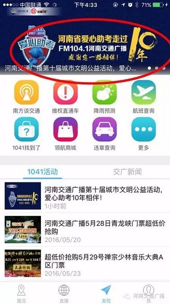 高考期間,河南交通廣播倡導全省車友綠色出行、在交廣領航上用愛心點亮河南地圖;