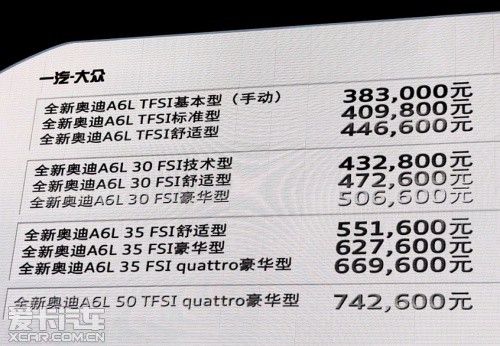 3月28日,全新一代奧迪A6L正式國內(nèi)上市,新奧迪A6L采用了全新的家族式外觀設(shè)計,車身尺寸進(jìn)一步加長,并且配置上全面升級。動力上,新A6L將搭載2.0T、2.5L、2.8L、以及3.0TFSI,并且將采用全新的尾部標(biāo)識。新一代奧迪A6L共推出10款車型,售價區(qū)間為38.3-74.26萬元,具體車型售價如下表所示: