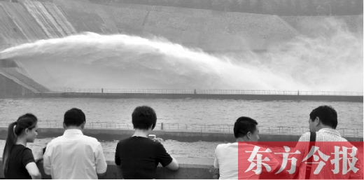 昨天,東方今報記者在濟源市小浪底庫區(qū)看到,9時一到,一條水龍從小浪底大壩口噴涌而出,驚濤拍岸。河水墜入河道濺起的細小水滴,撲打在附近游人的臉上,遠遠地就能感受到陣陣涼意。