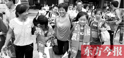 昨天下午3點(diǎn),在新鄭國際機(jī)場(chǎng)大廳等待已久的隊(duì)員家長(zhǎng)們,終于迎來臨潁縣女子足球隊(duì)的小隊(duì)員們。當(dāng)家長(zhǎng)們看見隊(duì)員從大廳里整齊走出來,都圍了上去,紛紛念叨著“瘦了,黑了”。李女士說,大約有7名小隊(duì)員的家長(zhǎng)來鄭州接機(jī),幾乎所有的孩子河南省都沒出過。隨后,小隊(duì)員和家長(zhǎng)們陸續(xù)坐上了趕往河南建業(yè)球場(chǎng)的大巴。