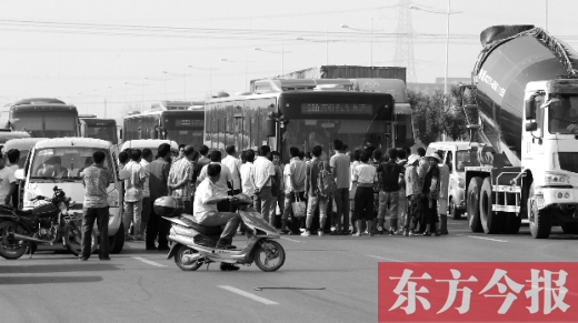 班線車和12輛600路公交車互堵,車上的乘客只能下車換乘其他交通工具,黑車趁機(jī)提價(jià),生意紅火。