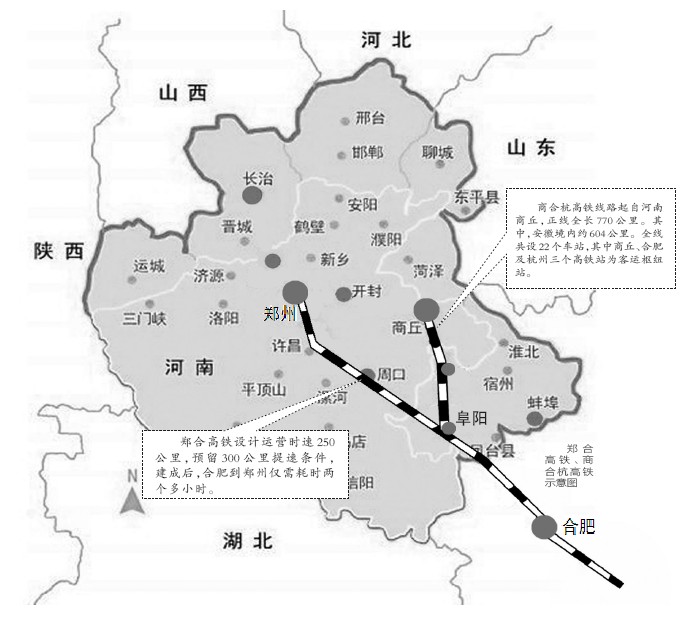 其中,安徽境內(nèi)約604公里,全線共設(shè)22個車站,商丘、合肥及杭州三個高鐵站為客運(yùn)樞紐站。由國家鐵路總公司投資,部分路段今年年底開工建設(shè)。