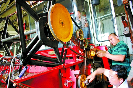 5月7日,武陟縣農(nóng)機局的技術(shù)人員正在幫助農(nóng)機手檢修小麥?zhǔn)崭顧C?!叭摹迸R近,武陟縣農(nóng)機局組織技術(shù)人員深入鄉(xiāng)村,對全縣參加跨區(qū)作業(yè)的800多臺小麥聯(lián)合收割機進(jìn)行全面檢修,并對機手進(jìn)行安全操作技能培訓(xùn),做好參加跨區(qū)麥?zhǔn)铡皶?zhàn)”的準(zhǔn)備。  馮小敏 李福利 攝