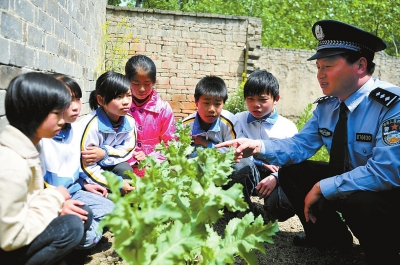 “你們看這些花蕾多美??!其實(shí)是毒花,它的果實(shí)就是罌粟,能生產(chǎn)毒品海洛因……”5月1日,在“掃毒害保平安”專項(xiàng)整治活動(dòng)中,正陽縣公安局雷寨派出所民警在關(guān)路口村鏟毒現(xiàn)場,手把手教留守學(xué)生識別罌粟,遠(yuǎn)離毒品。(記者 陳磊 特約記者 朱劍鋒 通訊員 張耀中 攝影)