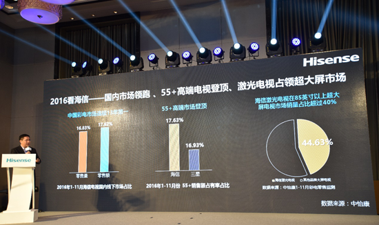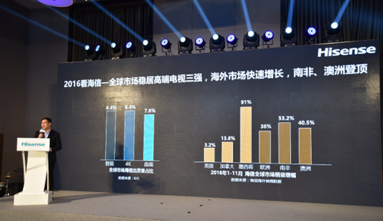 根據(jù)IHS全球彩電出貨統(tǒng)計(jì)數(shù)據(jù),2016年1-3季度,海信電視在智能電視、4K電視、曲面電視等高端彩電市場(chǎng)上均高居全球前三,成為全球高端電視三強(qiáng)品牌。