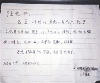 事情發(fā)生在12月18日。柏宇告訴成都商報(bào)記者,當(dāng)天下午她外出買了冒菜回家,走到小區(qū)門口,一不留神撞到了旁邊一輛轎車的車頭,彎腰擦膝蓋時(shí)發(fā)現(xiàn),轎車車牌面板被撞彎了。隨后,她跑回家寫了一張字條然后把字條貼到了轎車擋風(fēng)玻璃上,“車主您好,我是潤新花園的一名住戶,我于2015年12月18日周五18點(diǎn)15分左右撞到了您的車牌,使之撞歪,在此表示誠摯的道歉,對不起,若您的車牌有什么問題,我將全權(quán)負(fù)責(zé)”,她還留下了手機(jī)號碼。