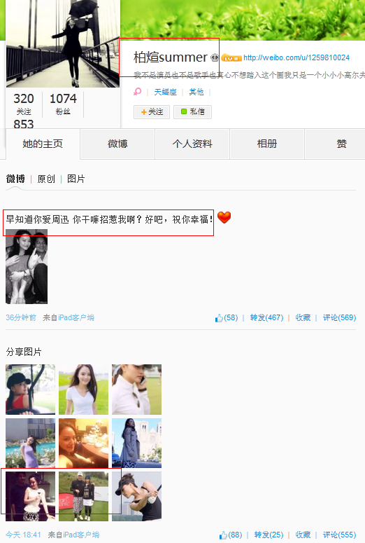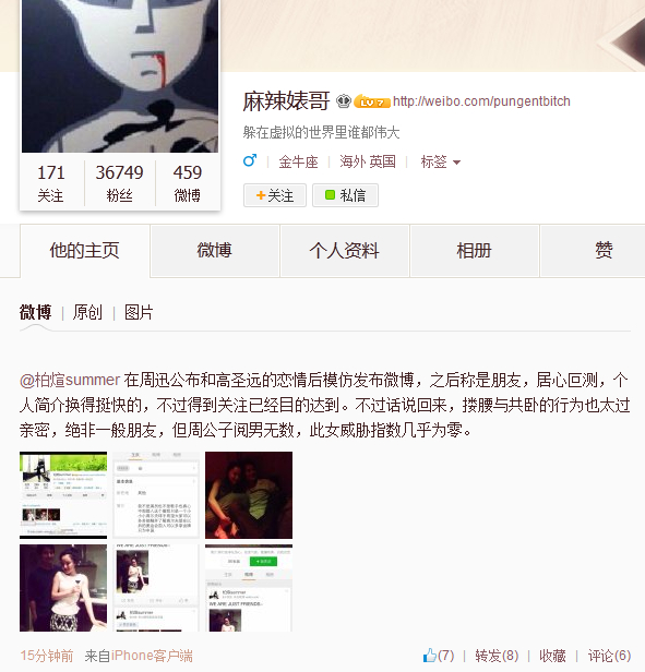 該微博也引起了不少熱心網(wǎng)友的注意,微博@麻辣婊哥懷疑@柏煊summer在刻意炒作,微博稱:“@柏煊summer 在周迅公布和高圣遠(yuǎn)的戀情后模仿發(fā)布微博,之后稱是朋友,居心叵測(cè),個(gè)人簡(jiǎn)介換得挺快的,不過得到關(guān)注已經(jīng)目的達(dá)到。不過話說回來,摟腰與共臥的行為也太過親密,絕非一般朋友,但周公子閱男無數(shù),此女威脅指數(shù)幾乎為零。 ”