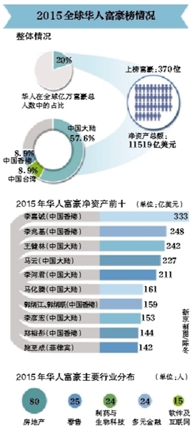 從行業(yè)分布看,華人富豪前十中,房地產(chǎn)巨頭依然占據(jù)最多席位。此外,2015年上榜的370位華人富豪中,房地產(chǎn)依舊牢牢占據(jù)著第一的位置,有80位、超過20%的華人富豪涉足房地產(chǎn)行業(yè)。其中,大連萬達(dá)集團(tuán)董事長王健林以凈資產(chǎn)242億美元躋身前三,也是大陸富豪第一位。(記者 梁薇薇)