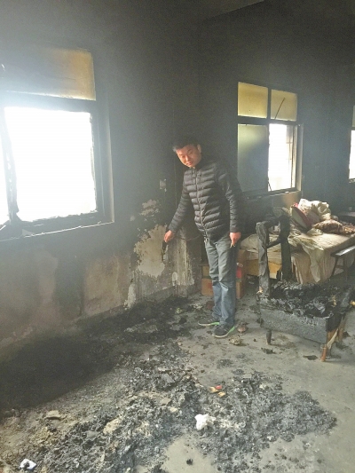 大河報(bào)記者看到,殯儀館現(xiàn)場(chǎng)有燒黑的一團(tuán)團(tuán)東西散落。進(jìn)入靈堂內(nèi),東側(cè)墻角地上許多燒黑的粉末和碎屑,一張被燒得不成樣子的椅子。距離椅子有一步之遙是一張木板床,床上凌亂地放著破舊的鋪蓋。死者家屬稱(chēng),守靈的三個(gè)人就在這張床上出了事。