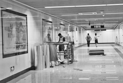 高溫之下,工人師傅正在進站口處抓緊施工。