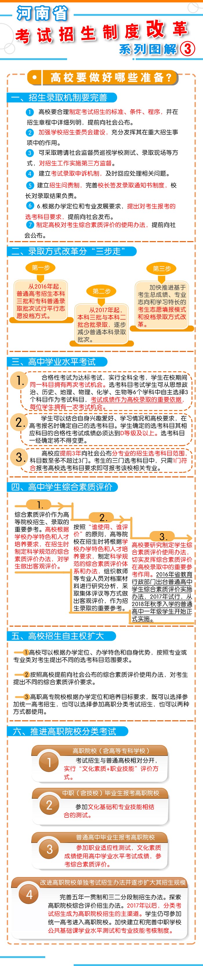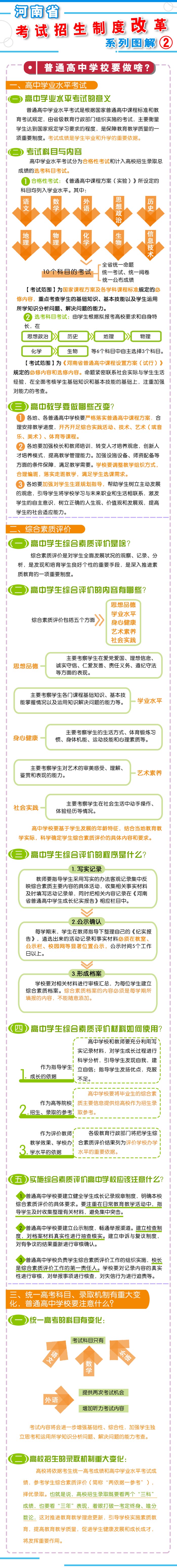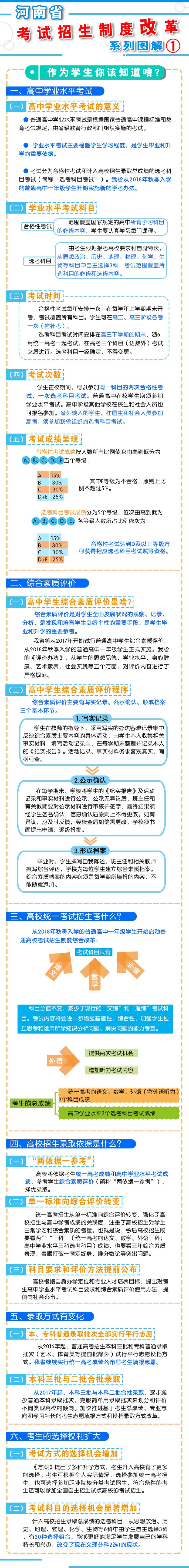 按照《方案》要求,我省從2018年秋季入學(xué)的普通高中一年級學(xué)生開始啟動高考綜合改革,考生總成績由統(tǒng)一高考的語、數(shù)、外3科成績和高中學(xué)業(yè)水平3個(gè)選考科目成績組成。招生錄取實(shí)行基于統(tǒng)一高考成績和高中學(xué)業(yè)水平考試成績、參考學(xué)生綜合素質(zhì)評價(jià)擇優(yōu)錄取機(jī)制。