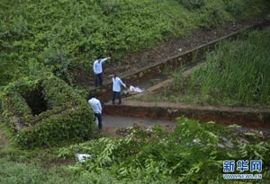 5月18日,工作人員在槽罐車(chē)泄漏現(xiàn)場(chǎng)附近的水渠邊查看情況。